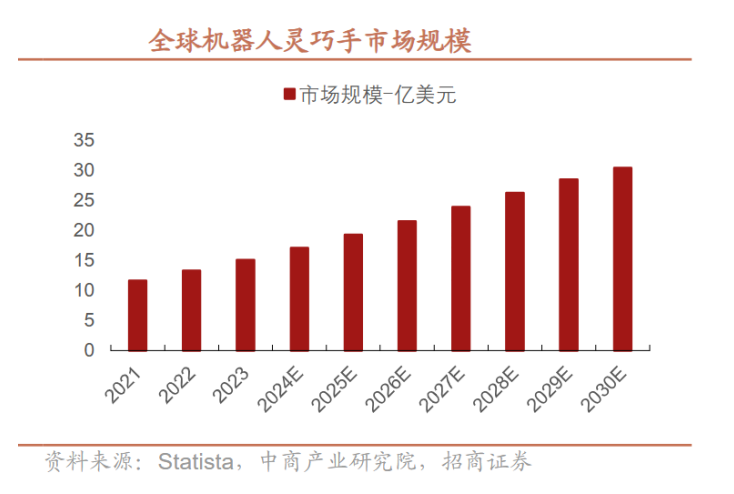 今年11月14日,兆威機電在機器人靈巧手發布會上全球首次展示了其最新研發成果——仿生靈巧手。這款產品采用了全驅動方案,擁有17個主動自由度,每個指節都能獨立驅動,完美融合了靈巧性和長壽命設計。作為人形機器人與外界交互的關鍵媒介,靈巧手不僅是機器人功能性的直接體現,而且在價值量上占有重要比重。據中商產業研究院預測,2023年全球機器人靈巧手市場規模達到15億美元,預計到2030年將突破30億美元,年復合增長率約為10.3%。這一技術突破不僅標志著兆威機電在微型傳動領域的先進地位,也顯示了公司在機器人領域的發展潛力。隨著人形機器人行業的迅猛發展,兆威機電有望通過靈巧手等創新產品進一步擴大其市場影響力。